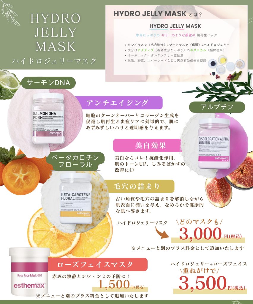 例:サクッと洗浄コース【¥3,000】+ハイドロジェリーマスク【¥3,000】=【¥6,000】